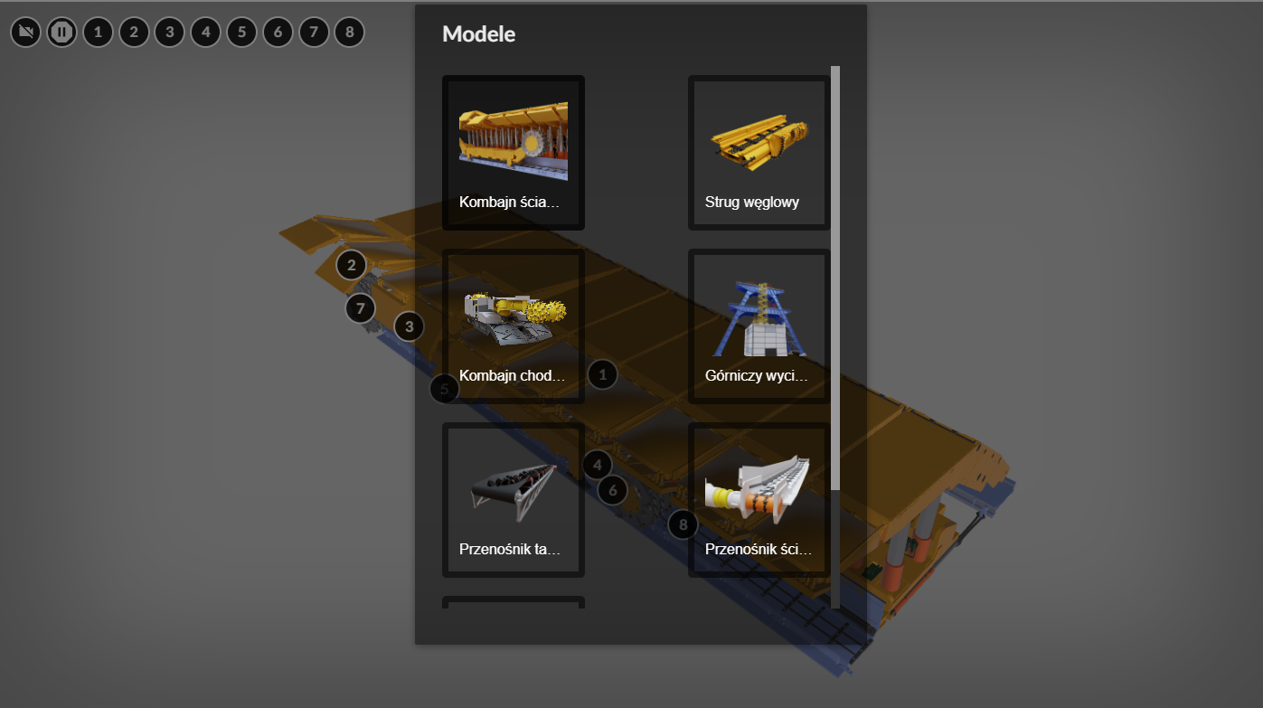 Na modelu zaznaczono kolejnymi cyframi poszczególne elementy przenośnika ścianowy. Po naciśnięciu danej cyfry rozwija się szczegółowy opis danego elementu wraz z nagraniem audio. Nagranie audio odpowiada tekstowi znajdującemu się w opisie elementu.