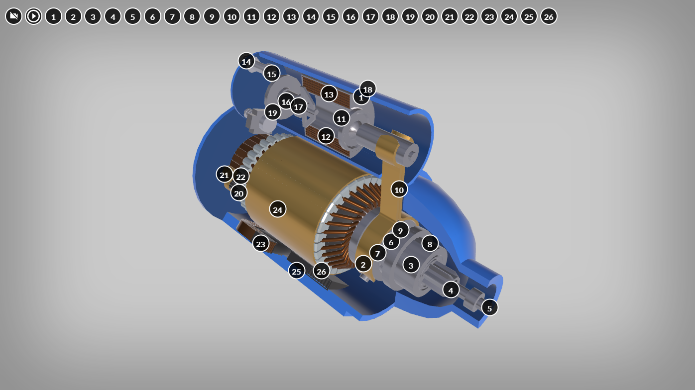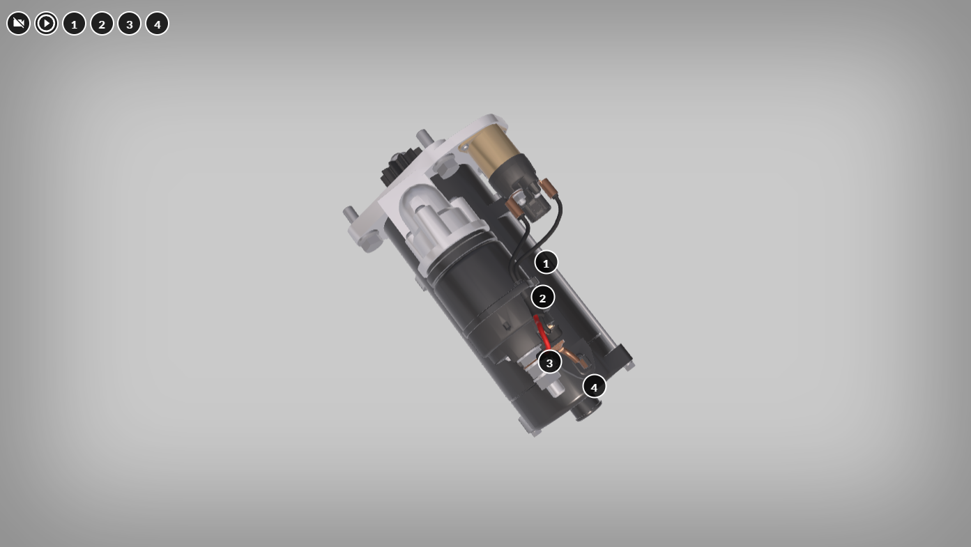 Opis alternatywny dotyczy wizualizacji 3D rozrusznika. Znaczną część rozrusznika zajmuje złoty element w kształcie walca. To twornik rozrusznika, na jego krańcach jest uzwojenie. Na lewym krańcu twornika są: komutator (ma postać karbowanego pierścienia), szczotka oraz szczotkotrzymacz. Nad nimi zaznaczono pokrywę. Po prawej stronie twornika są kolejno: pierścień prowadnicy, sprężyna śrubowa, zębnik zabezpieczony przez pierścień prowadnicy, następnie jest osłona. W prawo kolejno od tych elementów są: tuleja z gwintem trapezowym, tam też bieżnia, z tulei wychodzi zabezpieczenie w formie karbowanego wałka, następnie jest cienki wałek. Od osłony w górę prowadzi dżwignia, ma postać prostokątnej listwy. Na górze obręczą łączy się z rdzeniem elektromagnetycznym. W dolnej części rdzenia jest uzwojenie wciągające, w górnej uzwojenie trzymające. Pomiędzy uzwojeniami po lewej stronie pośrodku jest zwora (styk ruchomy) oraz sprężyna. Następnie w lewo jest styk nieruchomy oraz pokrywa. Na końcu styku nieruchomego jest zacisk prądowy. Całość tej części rozrusznika chroni obudowa elektrowyłącznika. Następnie w lewo jest styk nieruchomy oraz pokrywa. Opisano: 1. Rozrusznik. Składa się z silnika elektrycznego prądu stałego szeregowego lub szeregowo‑bocznikowego, mechanizmu sprzęgającego i zębnika, który sprzęga się na czas rozruchu z uzębionym wieńcem koła zamachowego silnika spalinowego. Podczas fazy zazębienia z wieńcem koła zamachowego silnika moment napędowy jest przenoszony przez zębnik osadzony na wałku rozrusznika na wał korbowy silnika. Energia potrzebna do rozruchu jest pobierana z akumulatora. Rozrusznik wprawia w ruch koło zamachowe silnika. Wywołany w ten sposób ruch obrotowy wału korbowego jest zamieniany na ruch posuwistozwrotny tłoków w cylindrach.