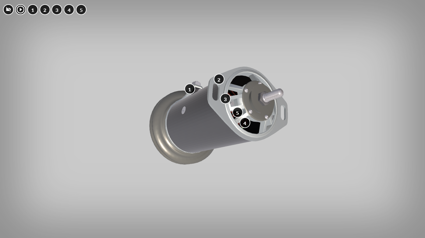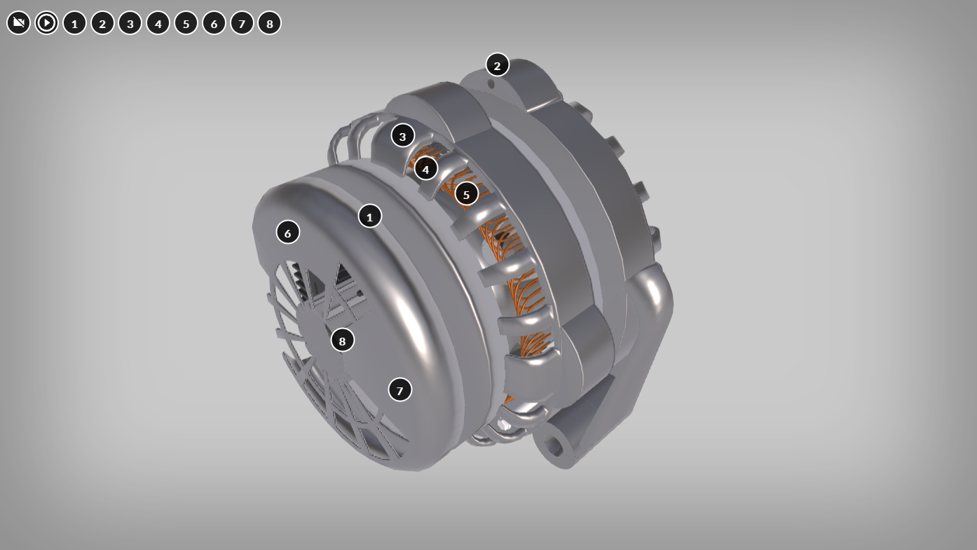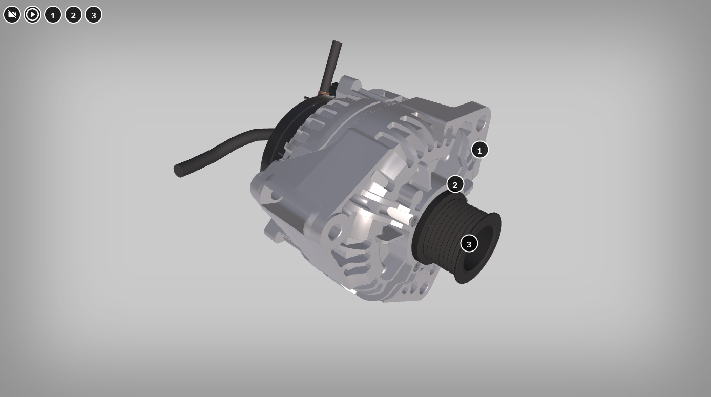 Wizualizacja ukazuje alternator. Zbudowany jest z tarczy łożyskowej z uchwytem mocującym, pod tarczą jest wirnik‑magnesica - ma trójkątne zęby zachodzące na siebie niczym zaciskające się grzebienie. Wewnętrz wirnika jest uzwojenie. Na uzwojeniu w górnej części wirnika jest stojan - twornik. Po lewej stronie alternatora znajduje się okrągły wentylator. Następnie wirnik kształtem przypominający walec. Po przeciwnej stronie alternatora niż jest umieszczony wentylator zlokalizowane są: regulator napięcia, zespół prostowniczy oraz łożysko. Opisano: 1. Trójfazowa prądnica prądu przemiennego. Napędzany jest od wału korbowego silnika za pomocą przekładni pasowej. Aby umożliwić współpracę alternatora z instalacją elektryczną pojazdu, należy przekształcić przebieg i charakterystykę napięcia, czyli przekształcić wytwarzany prąd przemienny trójfazowy na jednofazowy przebieg prądu stałego. Dzieje się tak dzięki układowi diod prostowniczych wbudowanych w alternator – jest to zespół prostowniczy i regulator napięcia.