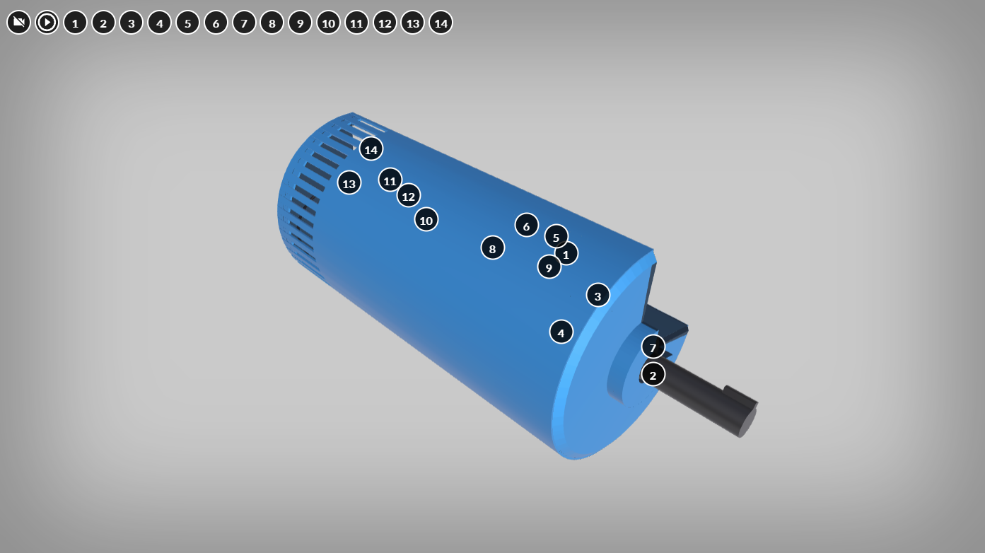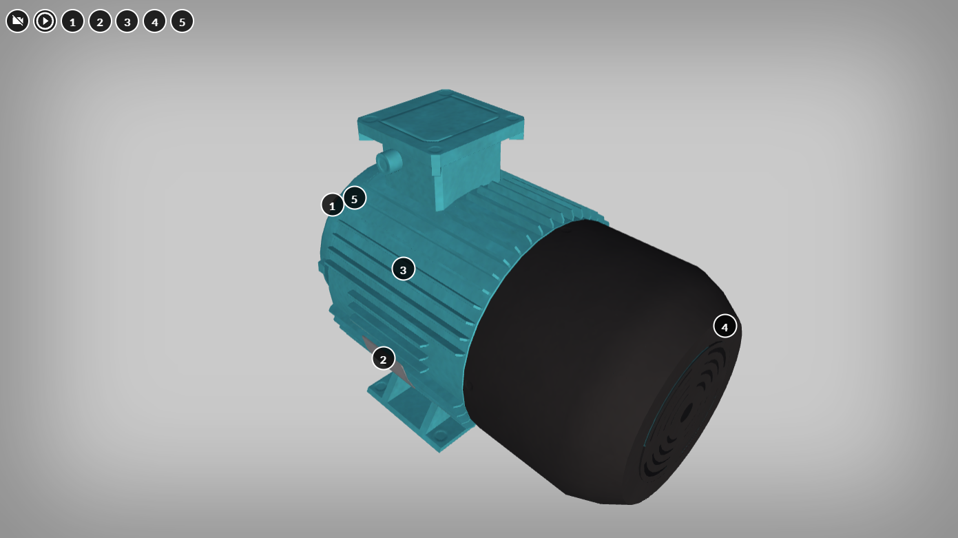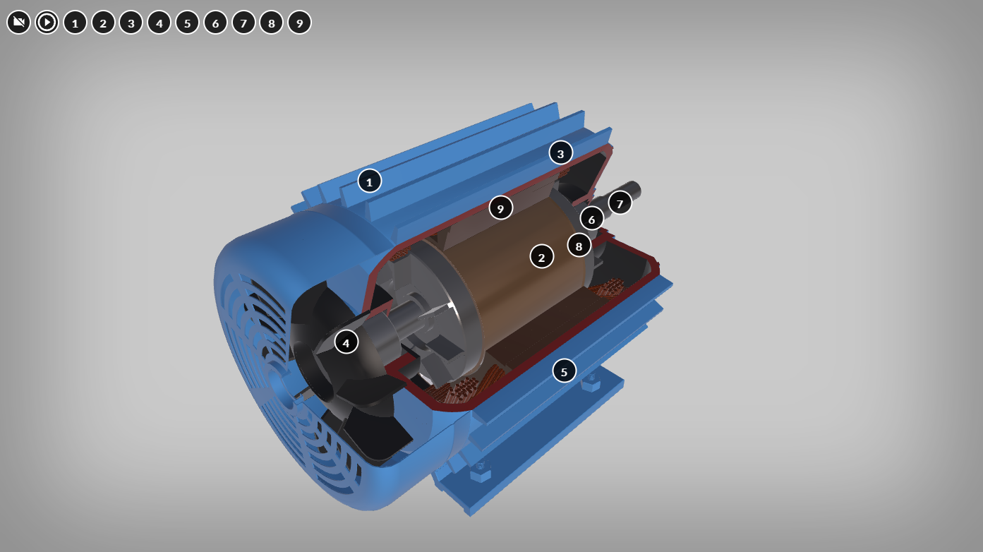 Wizualizacja przedstawia silnik elektryczny. Centralną część zajmuje wirnik w kształcie walca, zamocowany jest na łożyskach. Wszystko działa dzięki pracy uzwojeń i pola magnetycznego. Powyżej rdzenia wirnika zaznaczono rdzeń stojana i uzwojenie stojana. Zaraz za rdzeniem wirnika jest tarcza łożyskowa i łożysko, na dalej podłużny wał. Poniżej rdzenia wirnika zaznaczono jarzmo stojana. Po lewej stronie silnika znajduje się wentylator. Opisano: 1. Maszyna, która zamienia energię elektryczną prądu na energię mechaniczną. Podłączenie do silnika prądu elektrycznego wprawi go w ruch.