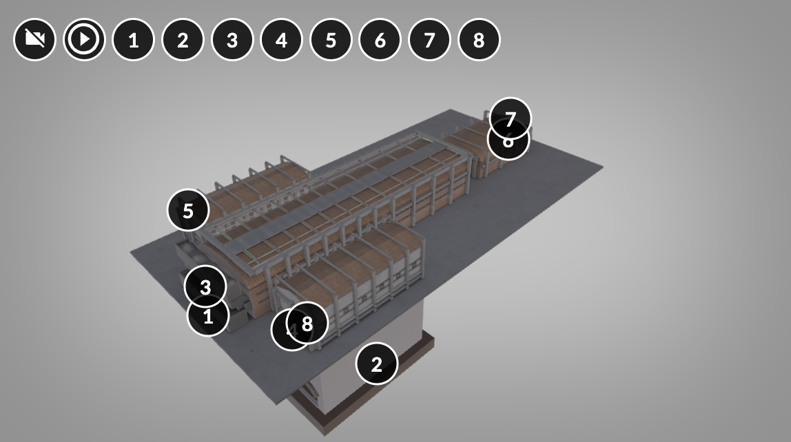 Ilustracja przedstawia piece szklarskie, piec float, oznaczony numerem 2. Składa się on z dwóch identycznych pionowych, głębokich komór, w których stoją ustawione w kratownice cegły szamotowe. Pod każdą z komór znajduje się palenisko. Komory połączone są ze sobą częścią przelewową, w której znajduje się masa szklana. Teksty planszy czytane są przez lektora. Podstawa, na której opiera się konstrukcja pieca oraz komór regeneracyjnych. Wykonana jest najczęściej ze zbrojonego betonu o wysokiej wytrzymałości mechanicznej. Maszty stalowe rekuperatora (regeneratora). Pionowe elementy konstrukcyjne, które służą do bezpośredniego wzmocnienia murów regeneratora. Ściany regeneratora są narażone na działania sił mechanicznych związanych z rozszerzaniem się materiałów ogniotrwałych pod wpływem temperatury. Kanał wlotowy/wylotowy rekuperatora (regeneratora). Element regeneratora, poprzez który są odprowadzane spaliny z regeneratora lub poprzez który przepływa powietrze do regeneratora. Kanał jest wykonany z kształtek ogniotrwałych.