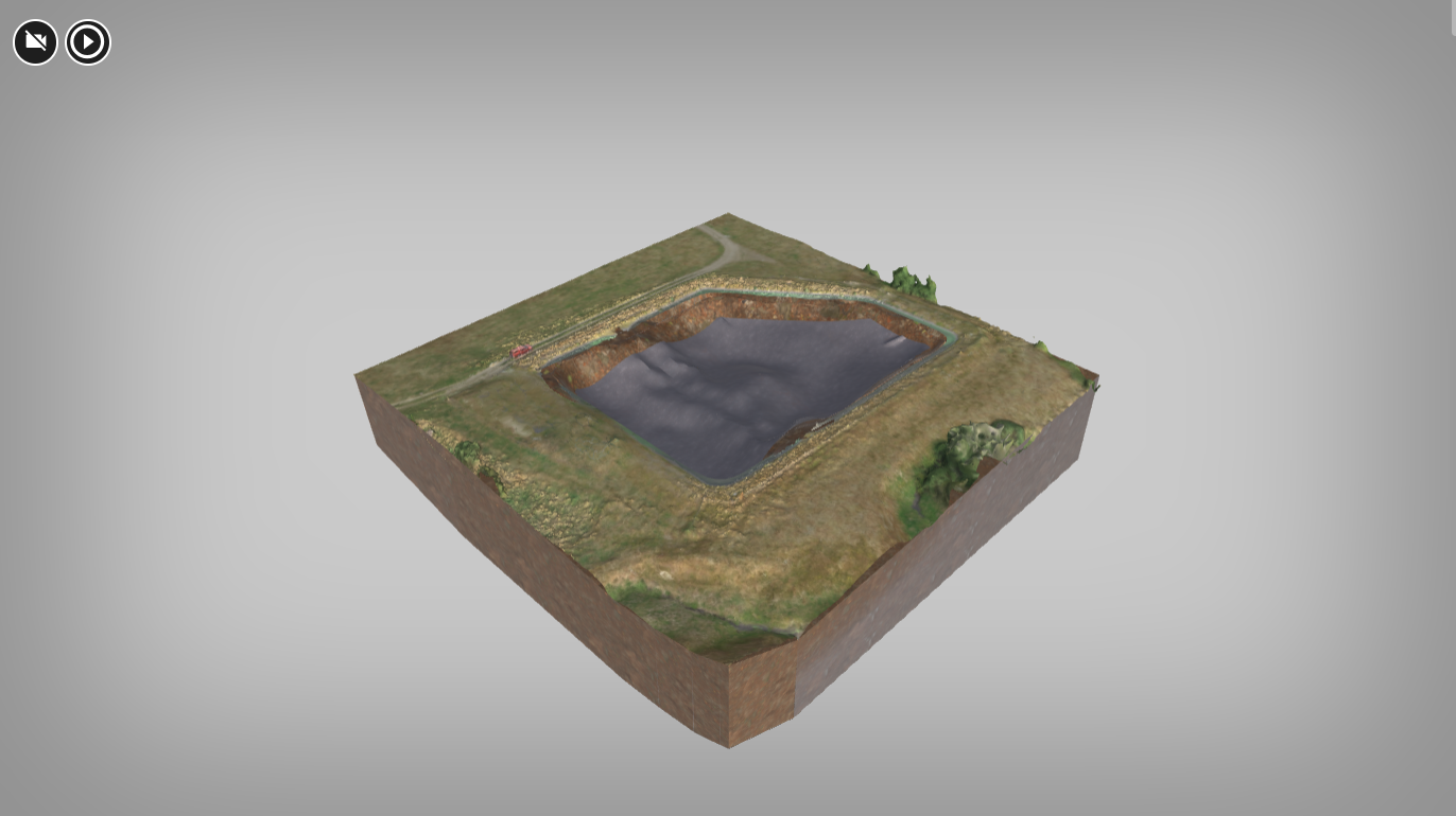 Wizualizacja 3D zatytułowana: Zakładanie stawu rybnego: przygotowanie dna stawu. Przedstawia fragment terenu zielonego z drogą dojazdową. Teren porośnięty jest trawą i pojedynczymi krzewami. W centrum jest wykopany dół stawu z widocznym dnem o nieregularnej wysokości. Na drodze stoi czerwony samochód.