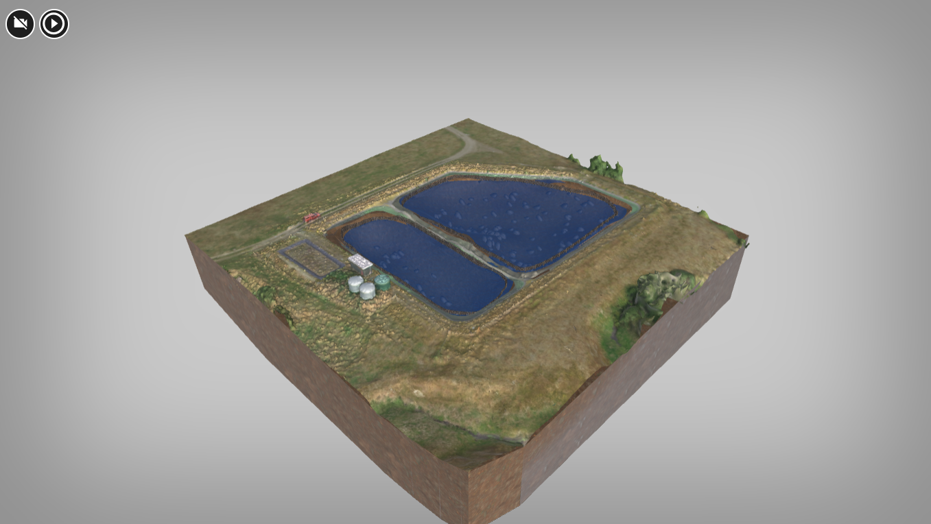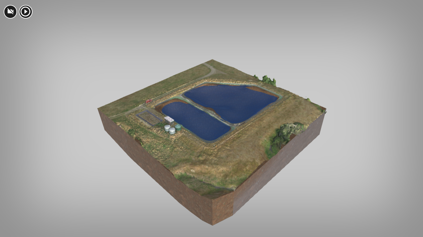 Wizualizacja 3D zatytułowana: Staw rybny. Przedstawia fragment terenu zielonego z drogą dojazdową. Teren porośnięty jest trawą i pojedynczymi krzewami. W centrum widoczne dwa stawy obok siebie - jeden większy, drugi mniejszy. Na dnie stawów widoczne są kamienie o różnej wielkości. Wzdłuż brzegów stawów ustawione jest drewniane ogrodzenie. Przy mniejszym stawie są zabudowania: niewielki budynek i trzy silosy. Na drodze stoi czerwony samochód.