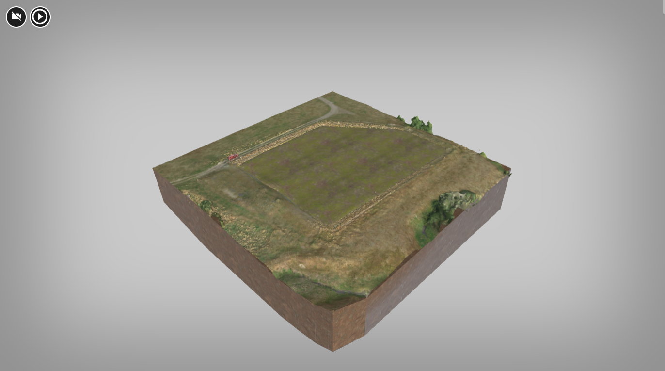 Wizualizacja 3D zatytułowana: Zakładanie stawu rybnego: wybranie odpowiedniego miejsca. Przedstawia fragment terenu zielonego z drogą dojazdową. Teren porośnięty jest trawą i pojedynczymi krzewami. W centrum teren jest płaski, a na jednym z boków są doły. Na drodze stoi czerwony samochód.