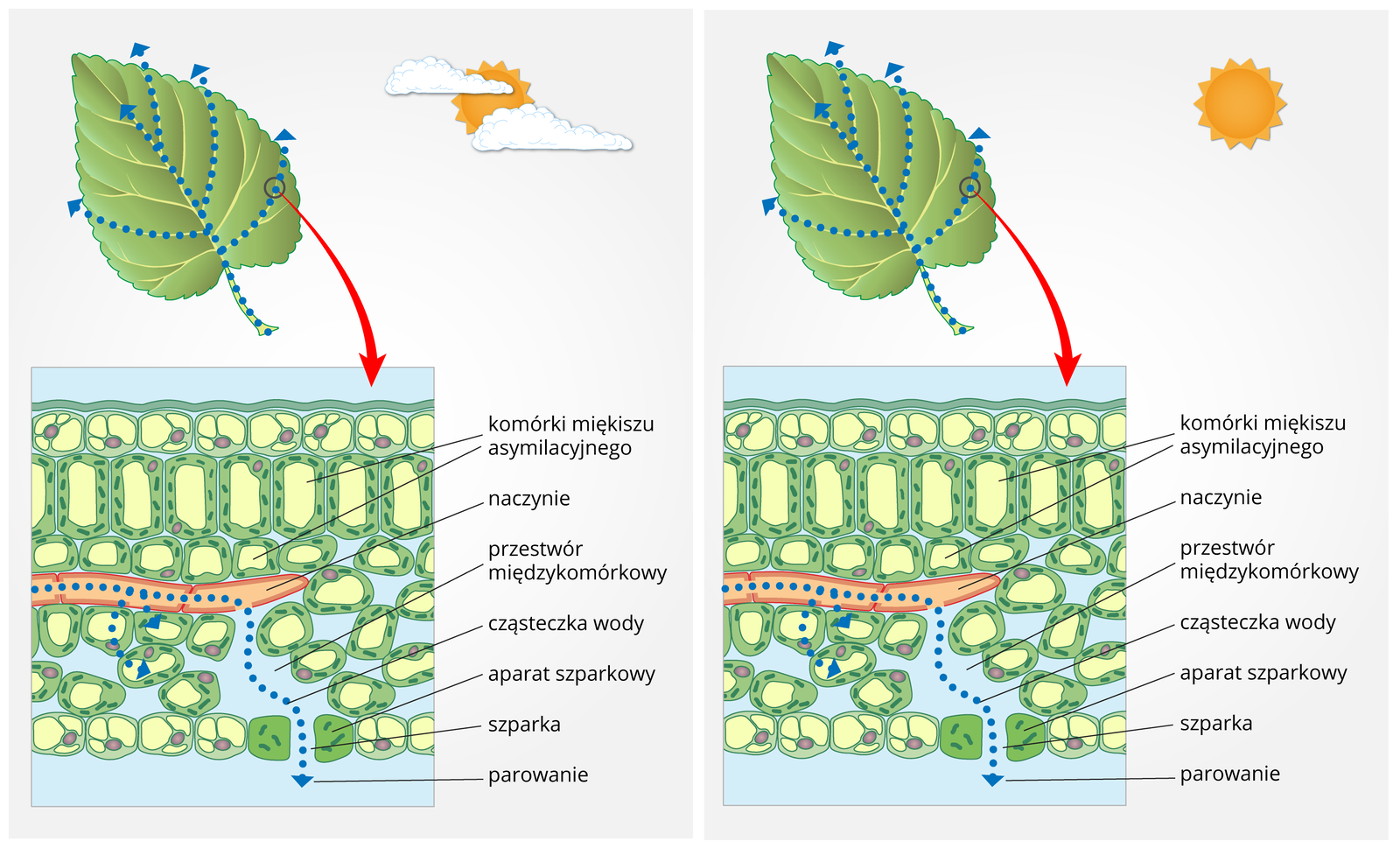 Ilustracja przedstawia trzy rysunki zielonych aparatów szparkowych w powiększeniu mikroskopowym. Pierwszy od góry to widok otwartej szparki. Dwie stykające się końcami, nerkowate komórki mają wewnątrz liczne zielone organelle – chloroplasty. Między nimi widać otwór. Poniżej ukazano schemat aparatu szparkowego w przekroju. Pod aparatem szparkowym znajduje się w liściu wolna duża przestrzeń. Otaczają ją komórki z chloroplastami. Po prawej stronie, w kole, znajduje się fotografia mikroskopowa skórki z aparatami szparkowymi. Znajdują się one pomiędzy prostokątnymi komórkami skórki.