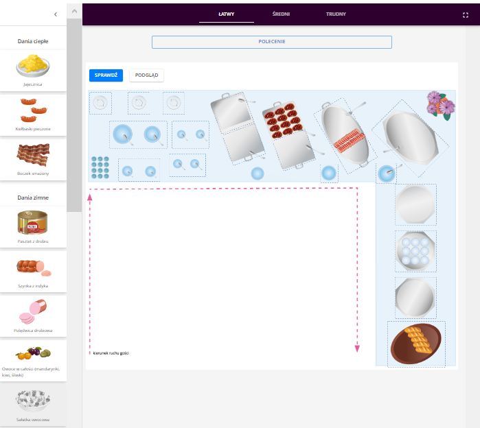 Grafika przedstawia przykładowy widok programu ćwiczeniowego zatytułowanego Bufet śniadaniowy – rozmieszczenie zastawy stołowej, sprzętu oraz potraw i napojów.