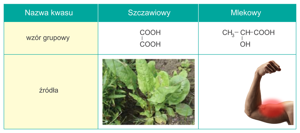 Ilustracja interaktywna przedstawiająca właściwości kwasów szczawiowego - oxalic acid i mlekowego - lactic acid, wzór grupowy oraz źródła występowania. Kwas szczawiowy ma wzór: ce o o ha wiązanie pojedyncze ce o o ha. Występuje: szczaw. Kwas mlekowy ma wzór: ce ha trzy wiązanie pojedyncze ce ha wiązanie pojedyncze w dół o ha, a w bok ce o o ha. Występowanie: mięśnie.
