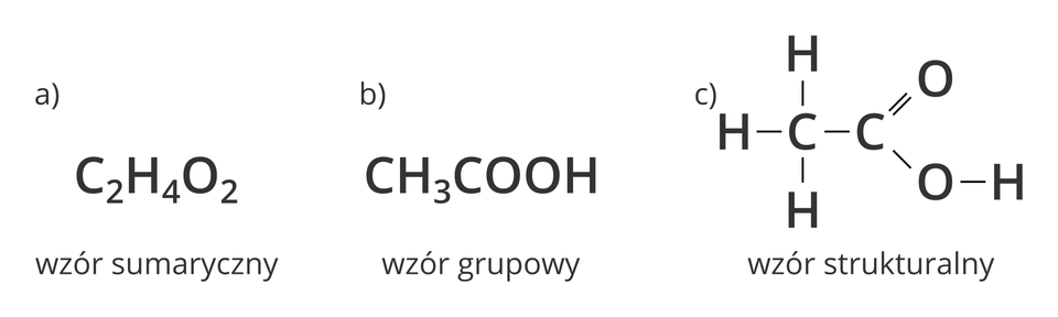 Ilustracja interaktywna przedstawiająca wzór chemiczny kwasu etanowego w trzech różnych formach: 1. ce dwa ha cztery o dwa opisany jako molecular formula, 2. ce ha trzy ce o o ha opisany jako group formula, 3. trzy atomy wodoru połączone z atomem węgla za pomocą pojedynczych wiązań (kresek) od atomu węgla pojedyncze wiązanie (kreska) do drugiego atomu węgla, do którego dołączony atom tlenu podwójnym wiązaniem (dwie równoległe kreski) oraz kolejny atom tlenu dołączony pojedynczym wiązaniem. Do tego atomu tlenu dołączony jeszcze jeden atom wodoru pojedynczym wiązaniem. Wzór opisany jako structural formula.