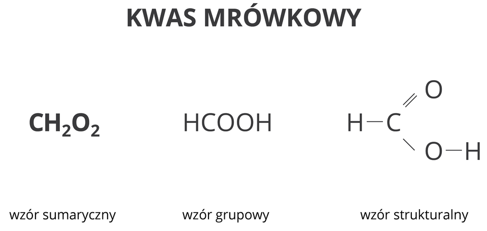 Ilustracja interaktywna przedstawiająca wzór chemiczny kwasu mrówkowego, formic acid, w trzech różnych formach: 1. ce ha dwa o dwa opisany jako molecular formula, 2. ha ce o o ha opisany jako group formula, 3. atom wodoru kreska (pojedyncze wiązanie) do atomu węgla Do atomu węgla dołączony atom tlenu podwójnym wiązaniem (dwie równoległe kreski) oraz kolejny atom tlenu dołączony pojedynczym wiązaniem. Do tego atomu tlenu dołączony jeszcze jeden atom wodoru pojedynczym wiązaniem. Wzór opisany jako structural formula.