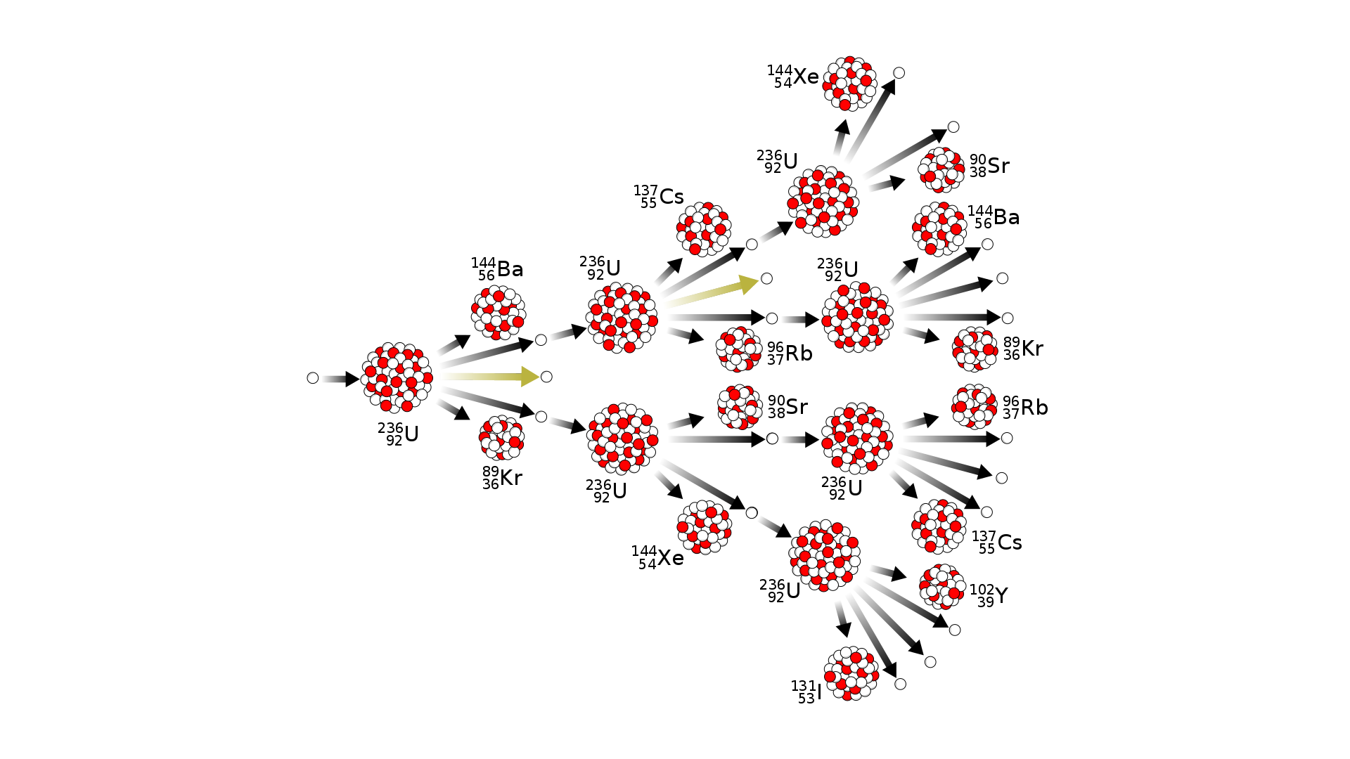 Na rysunku przedstawiona jest przykładowa reakcja rozszczepienia uranu-235. Rozszczepienie uranu-235 jest wyzwalane przez absorpcję poruszającego się neutronu o niskiej energii, zwanego neutronem powolnym (termicznym), po czym powstaje niestabilny izotop uran-236. W wyniku rozpadu uranu-236 powstają nowe jądra izotopów ciężkich pierwiastków baru-144 i kryptonu-89 oraz trzy neutrony. Bombardujący neutron oraz neutrony powstałe w reakcji oznaczone są małym białym kółkiem. Jądra biorące udział w reakcji zaznaczone są jako zbiory ściśle do siebie przylegających kółek białych i czerwonych. Poszczególne stadia reakcji oddzielone są od siebie strzałkami, wskazującymi kierunek przebiegu reakcji. Białe kółko podpisane n, obok znak plus, obok zbiór kółek podpisany w indeksie górnym 235, w indeksie dolnym 92, U. Od niego strzałka pozioma skierowana w prawo do zbioru kółek podpisanego w indeksie górnym 236, w indeksie dolnym 92, U. Od niego pięć strzałek w prawo do (od góry): zbioru kółek podpisanego w indeksie górnym 144, w indeksie dolnym 56, Ba; kółka białego podpisanego n, kółka białego podpisanego n, kółka białego podpisanego n, zbioru kółek podpisanego w indeksie górnym 89, w indeksie dolnym 36, Kr.