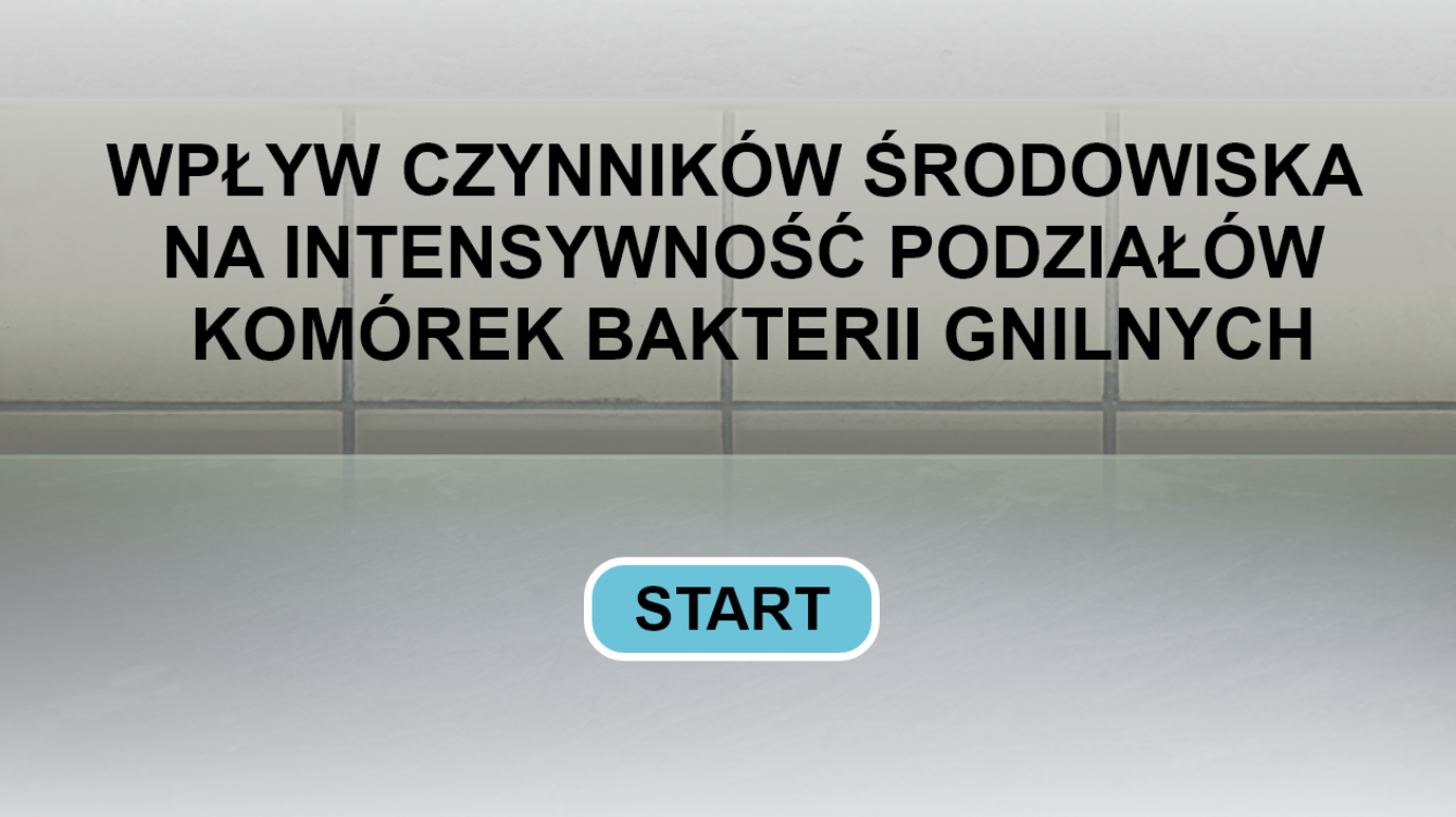 Symulacja przedstawia wpływ czynników środowiska na intensywność podziałów komórek bakterii gnilnych. Widoczna jest plansza interaktywna, na której można sprawdzić szybkość rozrostu bakterii w różnych warunkach. Znajduje się tam okrągłe szkiełko z bakteriami oraz trzy poziome kolumny. Pierwsza widoczna jest wilgotność. Przy bardzo słabej wilgotności bakterie mnożą się słabo i wolno, przy średniej jest ich więcej oraz tempo jest szybszej, a przy wysokiej wilgotności bakterie mnożą się bardzo szybko i licznie. Następnie widoczna jest temperatura. Przy temperaturze 0 stopni bakterie nie dzielą się, przy temperaturze 26 stopni bakterie dzielą się bardzo szybko i licznie, a przy temperaturze 45 stopni bakterie nie dzielą się. Następnie widoczna jest wentylacja. Przy jej braku bakterie dzielą się bardzo licznie i szybko, przy niskiej wentylacji bakterie dzielą się wolniej, przy średniej bardzo wolno i mniej licznie, a przy wysokiej i bardzo wysokiej bakterie nie dzielą się.