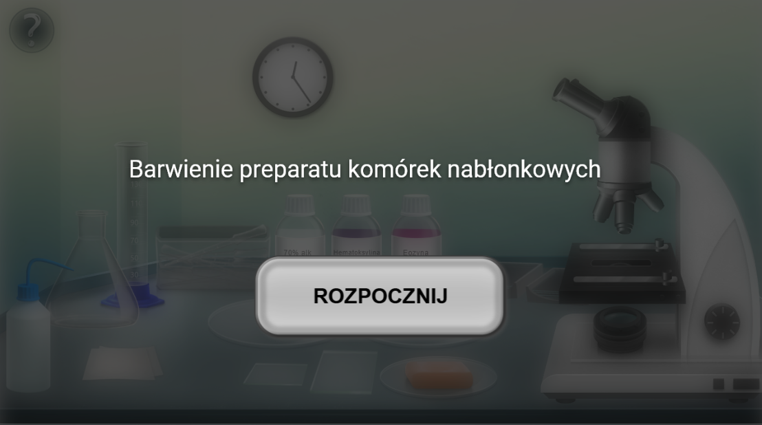 Wirtualne laboratorium ukazuje barwienie preparatu komórek nabłonkowych. Pod tytułem widać przycisk rozpocznij. Po kliknięciu na niego pojawia się stół laboratoryjny z: wodą destylowaną, bibułą, pipetami, szkiełkami zegarkowymi, szkiełkiem nakrywkowym, szkiełkiem podstawowym, patyczkiem higienicznym, alkoholem, hematoksyliną, eozyną, mikroskopem. W górnym lewym rogu widać przycisk ze znakiem zapytania. Po kliknięciu na niego wyświetla się instrukcja. Punkt pierwszy. Odtłuść szkiełko podstawowe, przecierając je alkoholem, a następnie bibułką. Punkt drugi. Potrzyj patyczkiem higienicznym wewnętrzną część policzka. Punkt trzeci. Przenieś pobraną próbkę na szkiełko podstawowe, pocierając patyczkiem powierzchnię szkiełka i poczekaj chwilę, aż wyschnie. Punkt czwarty. Umieść szkiełko podstawowe z preparatem w szkiełku zegarkowym i zalej hematoksyliną na cztery minuty. Punkt piąty. Przepłucz alkoholem szkiełko podstawowe z preparatem. Punkt szósty. Przepłucz preparat wodą destylowaną. Punkt siódmy. Umieść szkiełko podstawowe na nowym szkiełku zegarkowym i zalej eozyną na jedną minutę. Punkt ósmy. Ponownie przepłucz preparat wodą destylowaną. Punkt dziewiąty. Bardzo delikatnie osusz preparat bibułką. Punkt dziesiąty. Zamknij preparat szkiełkiem nakrywkowym. Punkt jedenasty. Umieść preparat na stoliku mikroskopu i przeprowadź obserwację. Po wykonaniu tych czynności pojawia się widok na preparat spod mikroskopu. Cytoplazma wybarwiła się na różowo, a jądro komórkowe na granatowo.