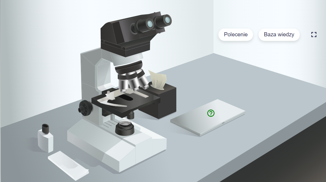 Wirtualny mikroskop pozwala na zapoznanie się z działaniem mikroskopu. Na ekranie głównym widać mikroskop, obok widać pudełko z preparatami mikroskopowymi, szkiełkami, olejkiem imersyjnym i chusteczkami. W górnym prawym rogu widać dwa przyciski. Po kliknięciu na przycisk baza wiedzy wyświetla się następujący tekst: Mikroskop optyczny (świetlny) umożliwia obserwację w powiększeniach nawet do 1500 razy, co pozwala na obserwowanie szczegółów budowy komórek i tkanek. Obraz widoczny w mikroskopie jest powiększony i odwrócony. Powiększenie obrazu widocznego w mikroskopie jest wypadkową dwóch elementów: powiększenia okularu oraz powiększenia obiektywu. Powiększeni okularu zazwyczaj wynosi dziesięć razy, natomiast obiektywy mają różne powiększenia. Obiektywy są umieszczone na rewolwerze, który umożliwia ich zmianę, a więc i zmianę całkowitego powiększenia oglądanego preparatu. Całkowite powiększenie można obliczyć, mnożąc przez siebie powiększenie okularu i powiększenie obiektywu. Należy pamiętać, że korzystając z obiektywów o wysokim powiększeniu (sto i więcej) konieczne jest użycie olejku imersyjnego. Jest to specjalny odczynnik, którego obecność poprawia skupienie światła, dzięki czemu zwiększa się rozdzielczość i kontrast uzyskanego obrazu. Kroplę olejku należy umieścić na preparacie, a następnie obniżyć obiektyw mikroskopu, aż dotknie kropli. Brak użycia olejku przy tak silnym powiększeniu skutkuje uzyskaniem ciemnego, rozmazanego obrazu. Należy pamiętać o dokładnym wytarciu preparatu po zakończeniu obserwacji lub przy powrocie do obiektywów o mniejszych powiększeniach. Nie należy dotykać palcami soczewek obiektywu, aby ich nie zabrudzić, ani nie uszkodzić. Do ich czyszczenia służą specjalne chusteczki, które nie powodują mikrozarysowań na powierzchni szkła. Drugi przycisk wyświetla polecenie. Brzmi ono: Przeprowadź obserwację mikroskopową komórek tkanki: kostnej, mięśniowej, nerwowej nabłonkowej oraz krwi. W tym celu kliknij na pudełko z preparatami mikroskopowymi. Tkanka kostna składa się z czarnych elementów, wokół których widać drobne kreseczki tworzące okręgi. Tkanka ma jasny kolor. Kreseczki są czarne. Tkanka mięśniowa składa się z różowych ułożonych pasami włókien. Tkanka nerwowa składa się z komórek nerwowych, które wybarwiają się na fioletowo. Ciało komórki jest szerokie, odchodzą od niego we wszystkie kierunki liczne wypustki. W środku ciała komórki widać ciemne okrągłe jądro komórkowe. Tkanka nabłonkowa składa się ze ściśle do siebie przylegających komórek. Komórki mają czteroboczny lub pięcioboczny kształt. W ich środku widać ciemno wybarwione jądro komórkowe. Krew składa się z licznych owalnych czerwonych komórek i mniej licznych jasnych komórek z ciemno wybarwionymi jądrami komórkowymi.