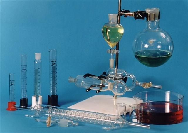 condenser, crystallizer, measuring glass, separating funnel, round-bottomed flask, stand, beaker