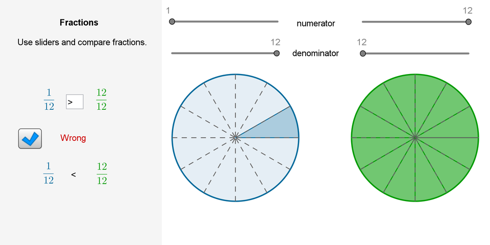 Na rysunku przedstawione są dwa koła. Koło po lewej podzielone jest na jedenaście części, koło po prawej na siedem części. Nad każdym z kół znajdują się suwaki. Dolne suwaki opisane denominator określają mianownik (pokazują, na ile części koła zostały podzielone). Górne suwaki opisane numerator określają licznik (pokazują, ile części zostało zamalowanych). Suwaki po lewej stronie rysunku wskazują, od góry 6 i 11, koło poniżej ma zamalowanych sześć części z jedenastu. Suwaki po prawej stronie rysunku wskazują, od góry 6 i 7, koło poniżej ma zamalowanych sześć części z siedmiu.