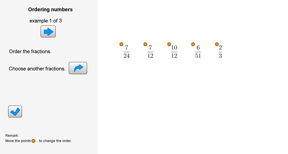 Rysunek przedstawia pięć punków opisanych za pomocą ułamków zwykłych: siedem dwudziestych czwartych, siedem dwunastych, dziesięć dwunastych, sześć pięćdziesiątych pierwszych, dwie trzecie. Należy je uporządkować, „przeciągając” punkty.