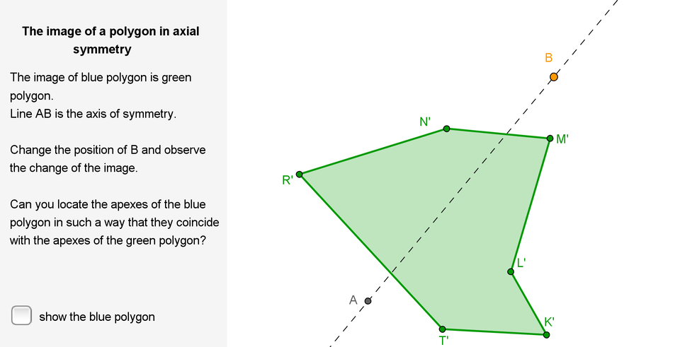 Rysunek przedstawia dwa takie same wielokąty w odbiciu lustrzanym częściowo narysowane na sobie. Jeden o wierzchołkach K L M N R T, drugi o wierzchołkach K prim L prim M prim N prim R prim T prim oraz prostą przecinającą wielokąty i przechodzącą przez punkty A B leżące na zewnątrz wielokąta.