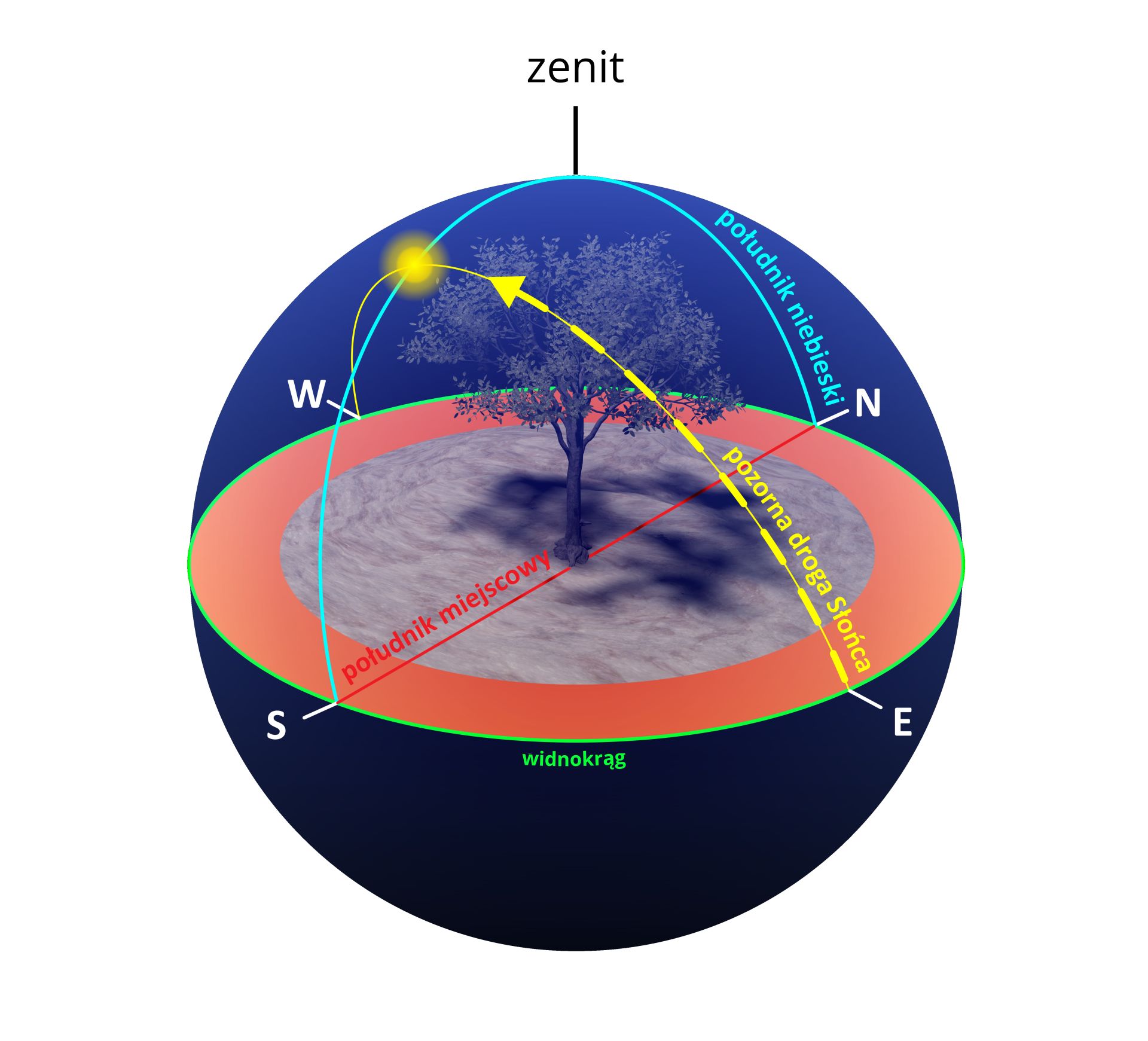 Solar noon is simultaneously recorded for the entire area located on the same meridian. The Sun is at its highest point simultaneously on the whole meridian, but at different heights in relation to the horizon. However, it is always the highest position of the Sun in a given place during the day. Of course, wherever there is a polar night, the Sun is invisible even at midday because it is below the horizon line also at the time when the Sun reaches its highest point. If an observer (located at any point on the globe) marked in the celestial sphere the place where the Sun is at its highest and connected it, in an arc, in the shortest way possible, with the point on the horizon that determines the south (S), and extended the opposite side to the zenith and further to the point on the horizon defining the north (N), this would be the line called the celestial meridiancelestial meridiancelestial meridian. Projection of the celestial meridian onto the surface of the Earth corresponds to the local meridian.