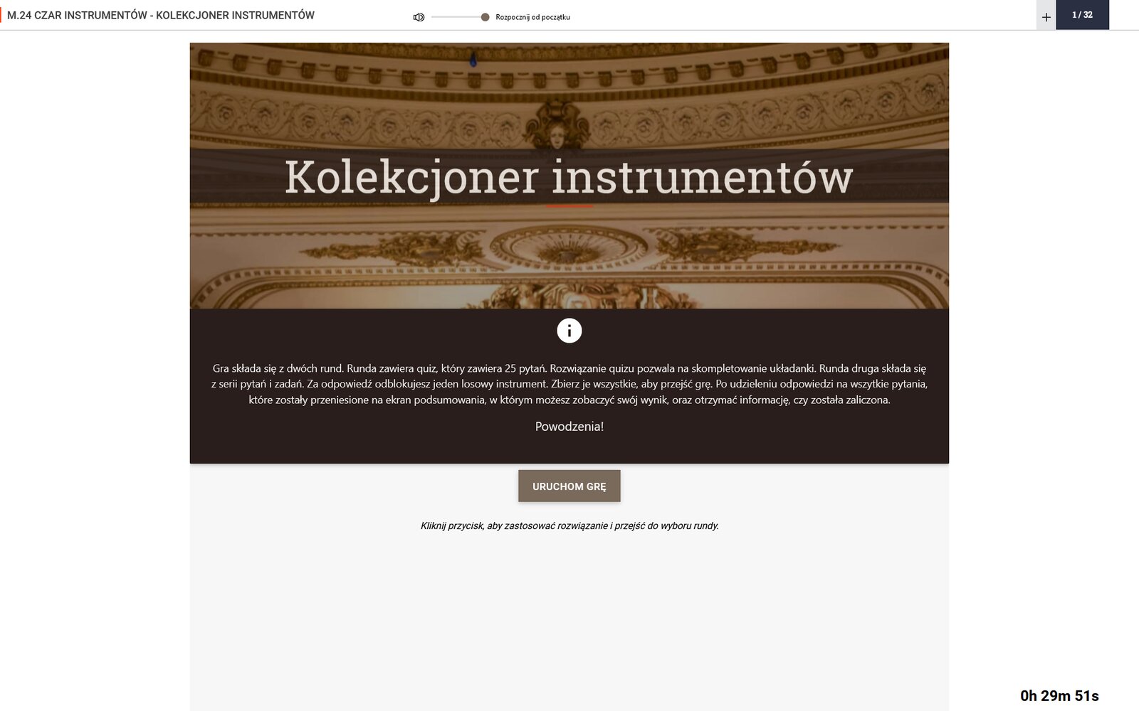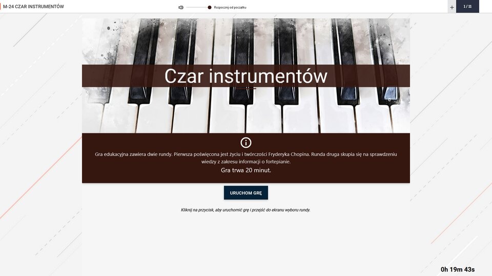 Gra edukacyjna składa się z dwóch rund. Runda pierwsza zawiera quiz, który składa się 25 pytań. Ta seria pytań sprawdza wiedzę z zakresu grup instrumentów. Rozwiązanie quizu pozwala na skompletowanie układanki. Runda druga dotyczy budowy instrumentów oraz ich historii. Zawiera 12 pytań. Po każdej odpowiedzi odblokuje się jeden losowy instrument. Celem tej rundy jest zebranie wszystkich instrumentów. Po udzieleniu odpowiedzi na wszystkie pytania użytkownik przechodzi do podsumowania zadań, w którym może sprawdzić swój wynik oraz dowiedzieć się czy gra została zaliczona.