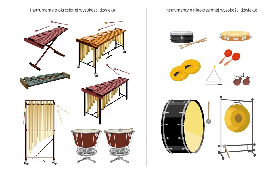 Uporządkuj instrumenty perkusyjne na: instrumenty perkusyjne o określonej wysokości dźwięku oraz na instrumenty perkusyjne o nieokreślonej wysokości dźwięku.
