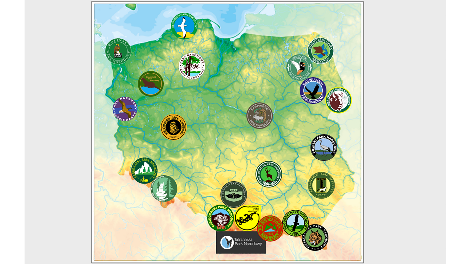 Kampinoski Park Narodowy, Biebrzański Park Narodowy, Świętokrzyski Park Narodowy, Bieszczadzki Park Narodowy, Karkonoski Park Narodowy, Słowiński Park Narodowy, Tatrzański Park Narodowy, Ojcowski Park Narodowy