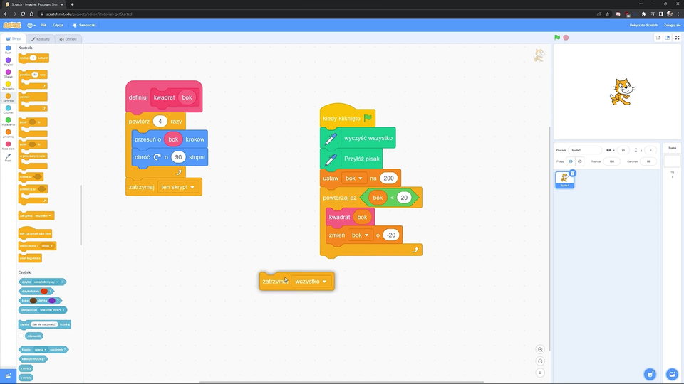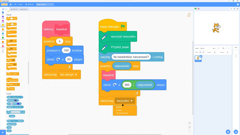 Duszek ma narysować kilka obróconych kwadratów. Wygodnie będzie zdefiniować własny blok rysujący pojedynczy kwadrat.