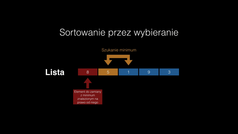 Liczby na liście mają być ustawione od najmniejszej do największej, a więc w pierwszym kroku można znaleźć liczbę najmniejszą i zamienić ją z pierwszym elementem listy. W kolejnym kroku postępujemy analogicznie poszukując liczby najmniejszej poczynając od drugiego elementu, następnie od trzeciego, itd. Powtarzamy więc wybieranie i ustawianie liczby najmniejszej n-1 razy (jak zostaje jedna liczba, to znajduje się już na właściwym miejscu, ciąg złożony z jednego elementu jest uporządkowany).