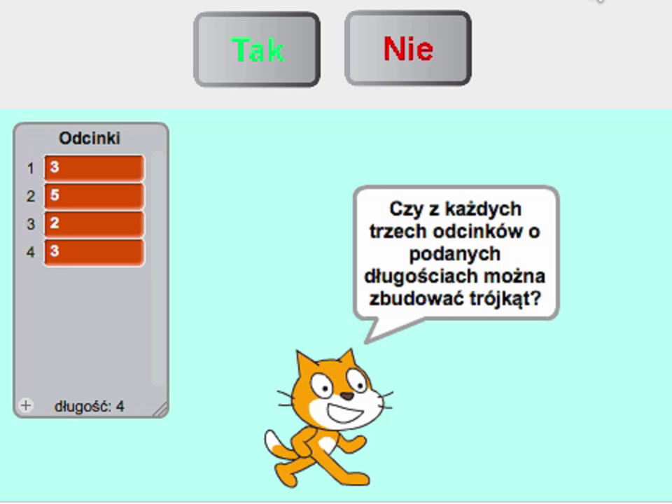 Gra będzie się składać z dwóch aplikacji. Zadaniem użytkownika pierwszej z nich jest odpowiedzenie na proste pytanie, czy z trzech odcinków o podanych długościach (wylosowanych przez duszka) można zbudować trójkąt. Duszek powinien sprawdzić odpowiedź i wyświetlić odpowiedni komunikat.