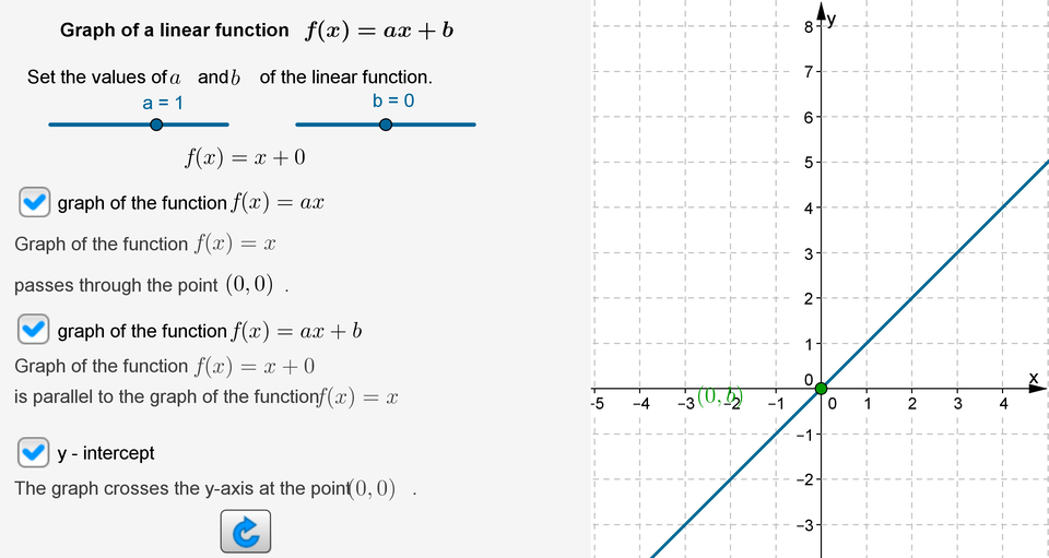 Wersja alternatywna ćwiczenia: There is plot of the function . Determine which sentences are true. Możliwe odpowiedzi: 1. A line that is the plot of the function f goes thorugh the point ., 2. A line that is the plot of the function f crosses the axis X in the point ., 3. A line that is the plot of the function f crosses the axis Y in the same point as the line ., 4. A line that is the plot of the function f is parallel to the line .