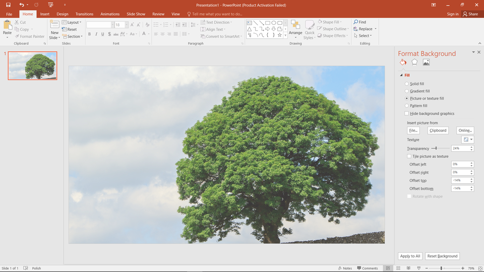 When creating a presentation, you can use a ready template or presentation theme. In such cases, the background of the slide is strictly (pre)defined by the slide pattern. When creating a presentation from scratch, one of the first steps in creating a presentation is to design a slide background. In PowerPoint, to do this, go to the Design ribbon and choose Background Design.