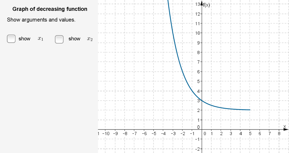 W układzie współrzędnych narysowany jest wykres funkcji malejącej f od x znajdujący się w drugiej i pierwszej ćwiartce. Zaznaczony jest punkt o współrzędnych minus trzy, dziesięć oraz punkt A o współrzędnych cztery i dwa. Na osi X zaznaczony jest punkt x jeden o współrzędnych minus trzy, zero i punkt x dwa o współrzędnych cztery, zero. Na osi Y zaznaczony jest punkt f od x jeden o współrzędnych zero, dziesięć i punkt f od x dwa o współrzędnych zero, dwa. Na osi X znajduje się strzałka pokazująca wzrost argumentów od minus trzy do cztery. Na osi Y znajduje się strzałka pokazująca spadek wartości funkcji od dziesięć do dwa.