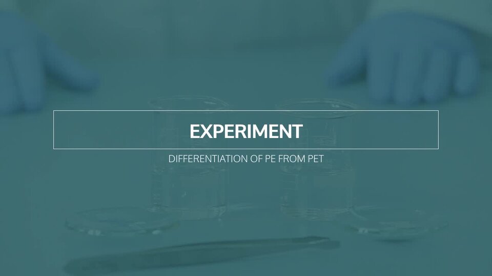 Film pokazujący eksperymenty które pozwolą nam odróżniać PE od PET. Na stole leżą zlewki z wodą, water, podstawka z poli(tereftalanem etylenu), polyethylene terephthalate, podstawka z polietylenem, polyethene i penseta, pincette. Do zlewek wrzucane są kawałki substancji z podstawek, polyethylene terephthalate tonie w wodzie, natomiast polyethene unosi się na powierzchni. Następuje druga część eksperymentu. Ustawione jest 8 zlewek z różnymi płynami w środku. Do każdej pary zlewek jest wlany jeden płyn. Pozwala nam to odróżnić PE od PET. Następny eksperyment polega na dostawianiu kawałka materiału do ognia. Materiał PE w płomieniu palnika spala się i topi po wyciągnięciu z płomienia. Materiał PET reaguje kurczeniem tylko podczas trzymania nad płomieniem.