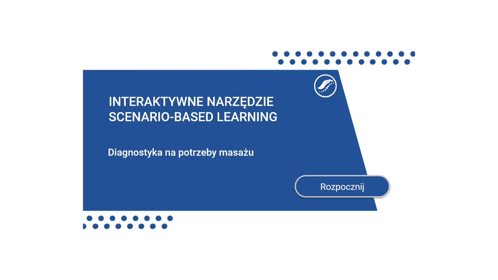 Interaktywne narzędzie typu scenario‑based learning „Diagnostyka na potrzeby masażu” rozpoczyna się ekranem startowym. Klikając przycisk Rozpocznij, gracz rozpoczyna rozgrywkę.