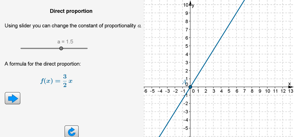Geogebra aplet - Proporcjonalność prosta. Galeria z opisami alternatywnymi poniżej.