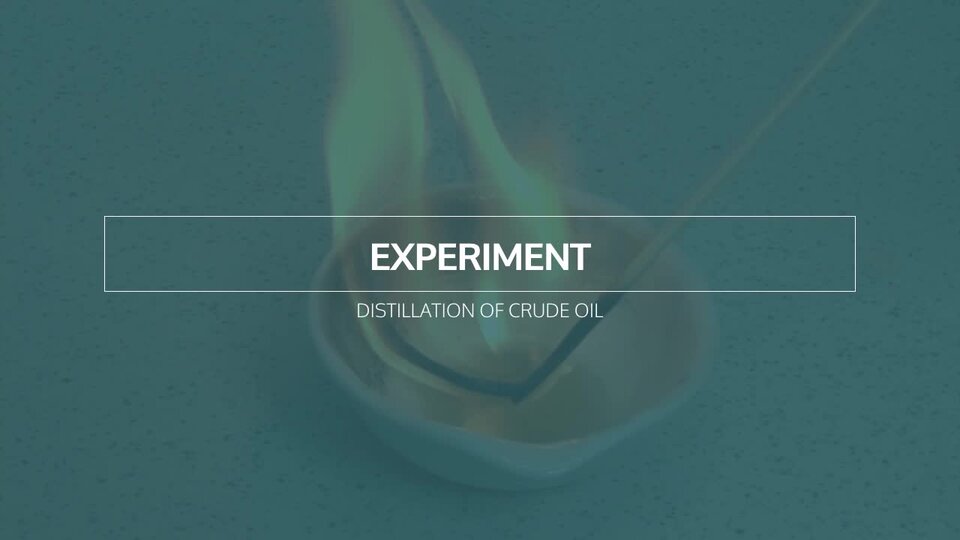 Film z eksperymentem. Zmontowano zestaw do destylacji, a następnie w kolbie okrągłodennej umieszczono ropę naftową oraz kamyczki wrzenne i rozpoczęto proces destylacji. Zebrano do osobnych odbieralników trzy frakcje wrzące kolejno w coraz wyższych temperaturach, a następnie przelano je do parownic i podpalano. Ciecz we wszystkich parownicach uległa zapaleniu, lecz im cięższa frakcja (ma wyższą temperaturę wrzenia) tym trudniej się zapala, a płomień jest coraz bardziej kopcący.