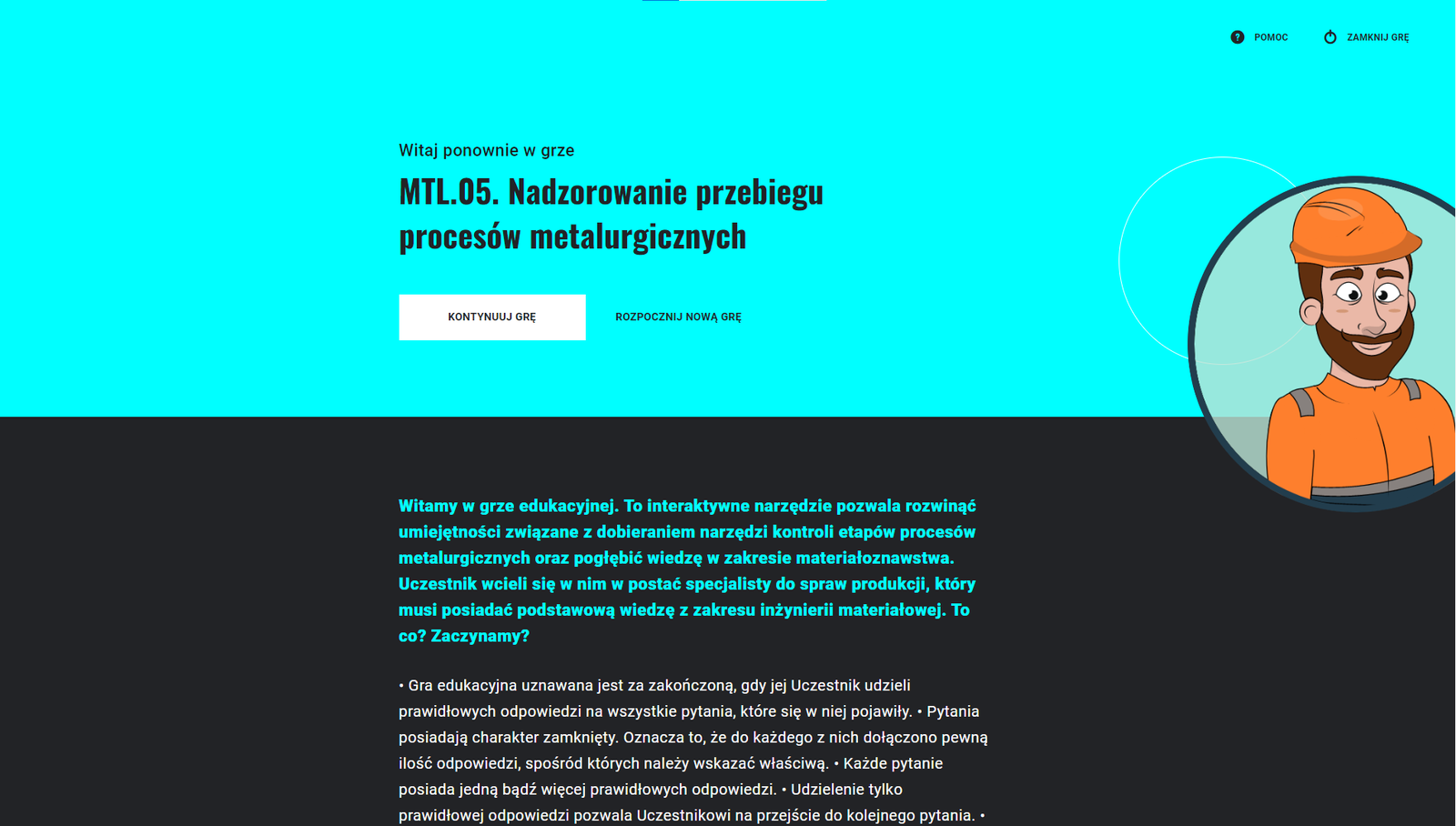 Ekran startowy gry składa się z nazwy kwalifikacji, opisu zasady działania gry, przycisku „pomoc”, przycisku „zamknij grę” oraz przycisku „rozpocznij grę”. W celu automatycznego zjechania na sam dół strony, należy użyć strzałki z podpisem „przewiń w dół”.