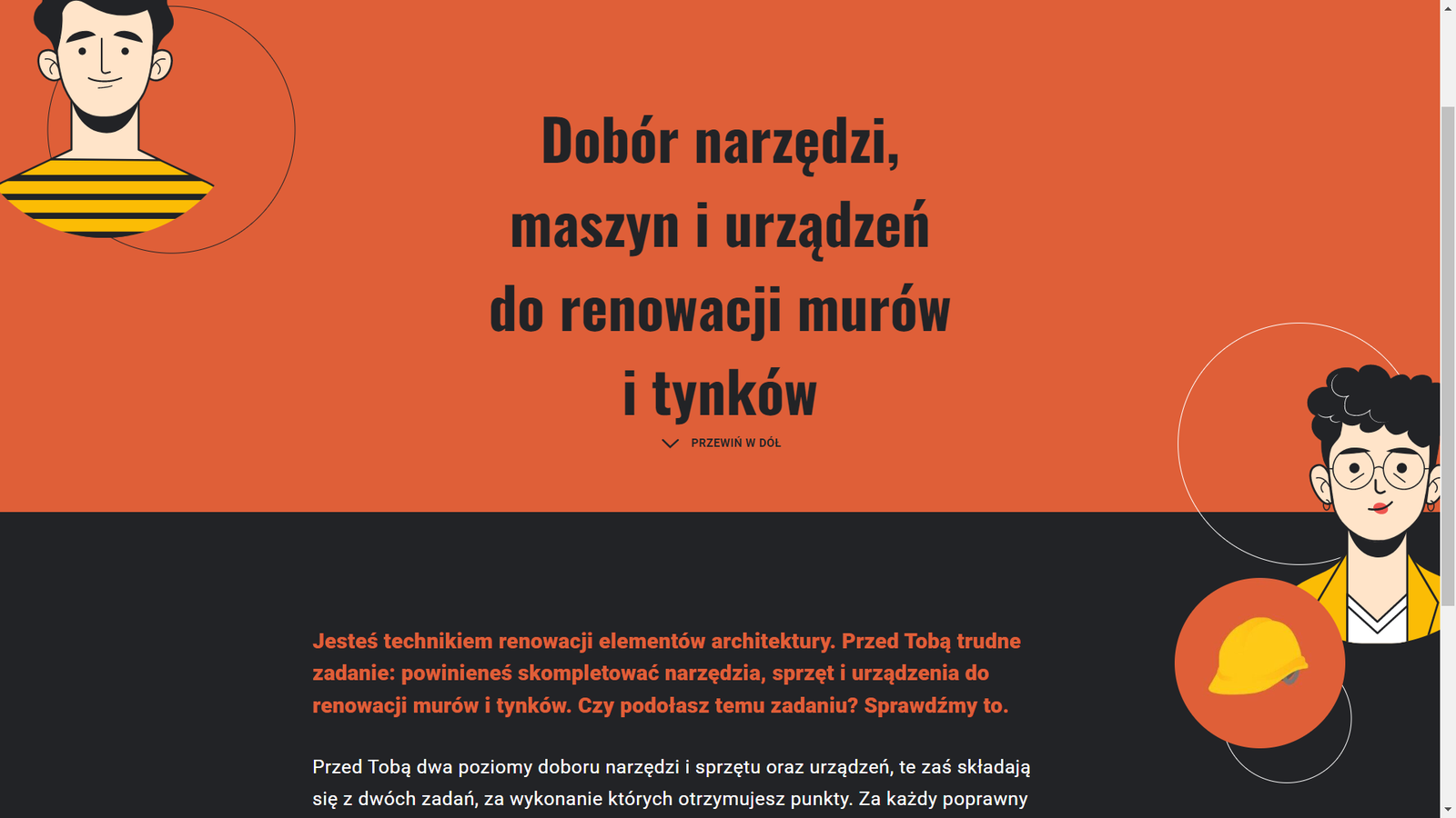 Gra edukacyjna – „Dobór narzędzi, maszyn i urządzeń do renowacji murów i tynków” wymaga trybu pełnoekranowego. Aby przejść do tego trybu, należy kliknąć przycisk: „Włącz tryb pełnoekranowy”.