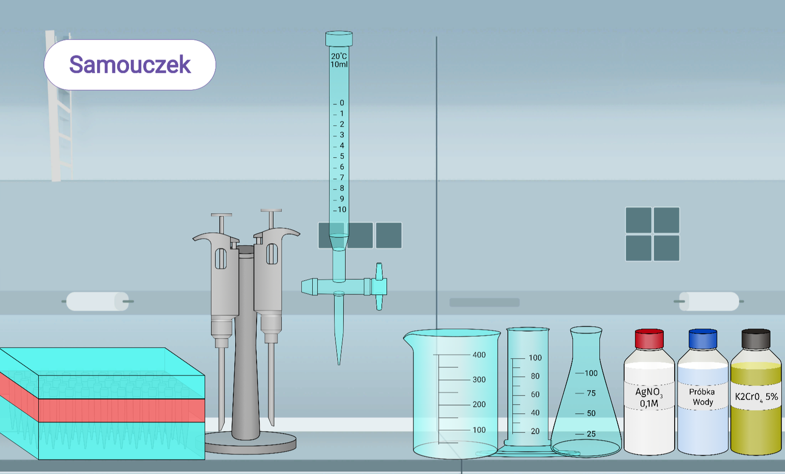 9. Z biurety odczytaj ile mililitrów AgNOIndeks dolny 3 zużyto do zmiareczkowania jonów chlorkowych i rozwiąż zadania znajdujące się pod symulatorem.