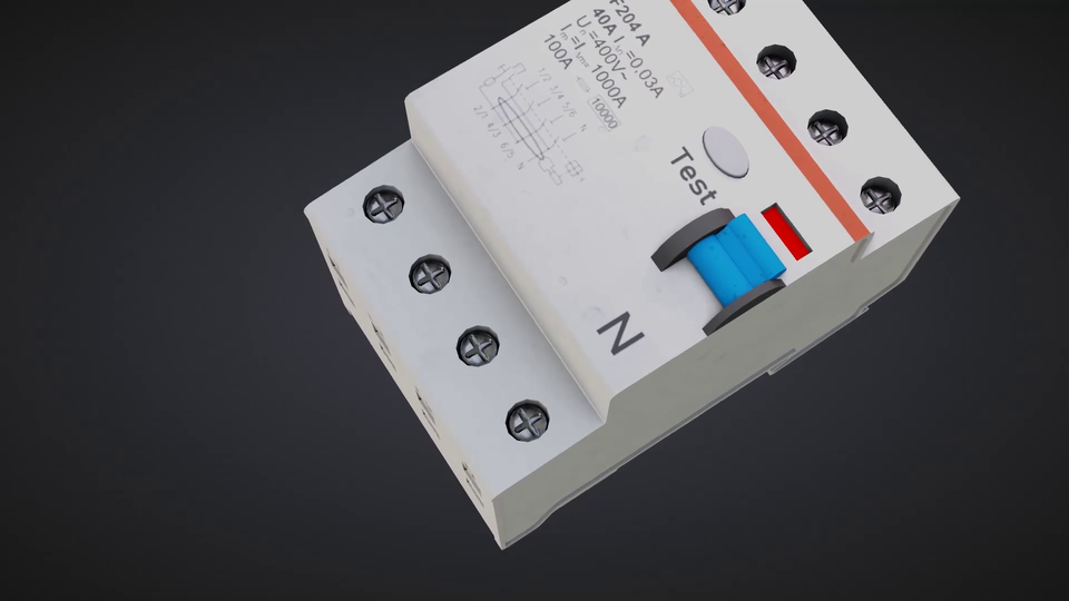 Przypisz nazwy elementów budowy wyłącznika różnicowoprądowego przedstawionego poniżej.