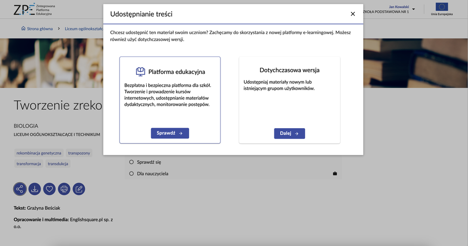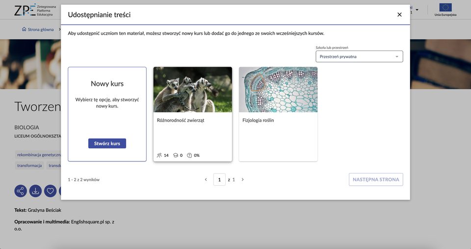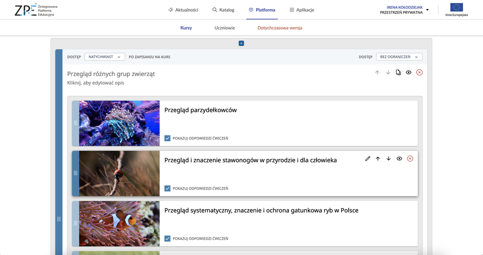 Wszystkie materiały dydaktyczne, które przeglądamy na Zintegrowanej Platformie Edukacyjnej można udostępnić uczniom w postaci kursu internetowego. Dotyczy to także materiałów zapisanych w „Ulubionych” lub stworzonych za pomocą „Teczki”.