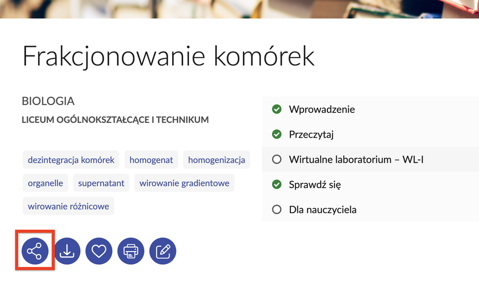 Aby dodać materiał do kursu należy kliknąć ikonę „Udostępnij” (pierwsza ikona widoczna w panelu spisu treści materiału).