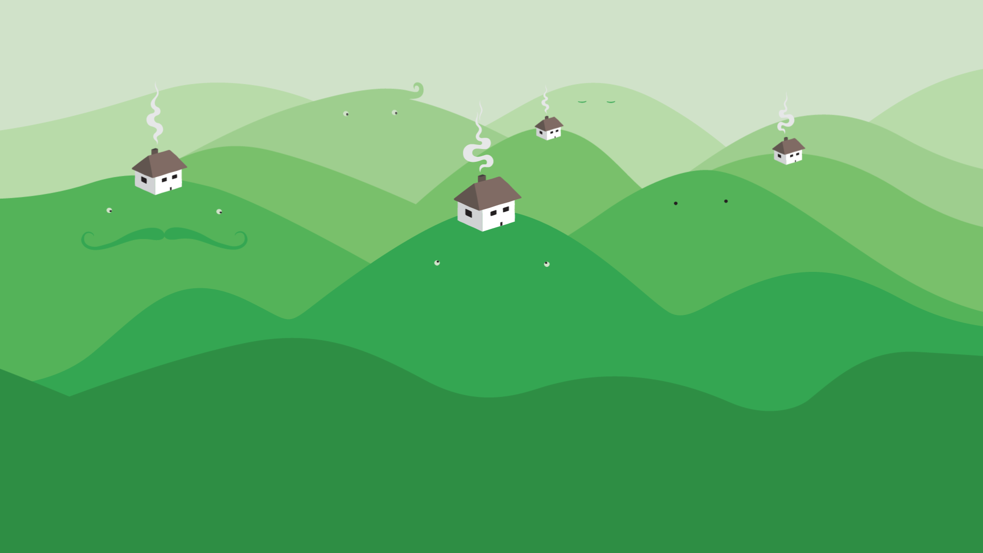 Grafika przedstawia cztery domy o spadzistych dachach, które stoją na wzgórzach. Domy mają kominy, z których leci dym. Wzgórza mają oczy. Tło jest jednolite.