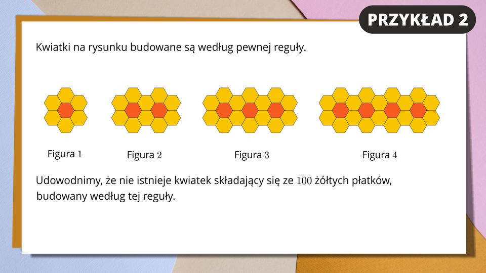 Na planszy slajdu pojawiają się figury w kształcie kwiatków. Każda część kwiatka, czyli środek lub płatek jest w kształcie sześciokąta. Pierwsza figura składa się z środka i sześciu płatków. Druga figura składa się z dwóch środków, ale dwa płatki pomiędzy dwoma środkami są wspólne dla obu kwiatków. Trzecia figura powstaje przez dołożenie trzeciego środka, gdzie również dwa płatki pomiędzy drugim a trzecim środkiem są wspólne. Każda kolejna figura powstaje w ten sam sposób.