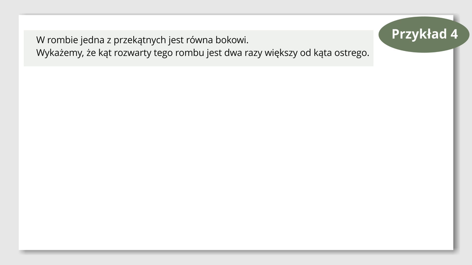 Lektor mówi: Zatem kąt ostry rombu ma miarę , a kąt rozwarty . Wynika z tego, że kąt rozwarty jest dwa razy większy od kąta ostrego, co należało udowodnić.