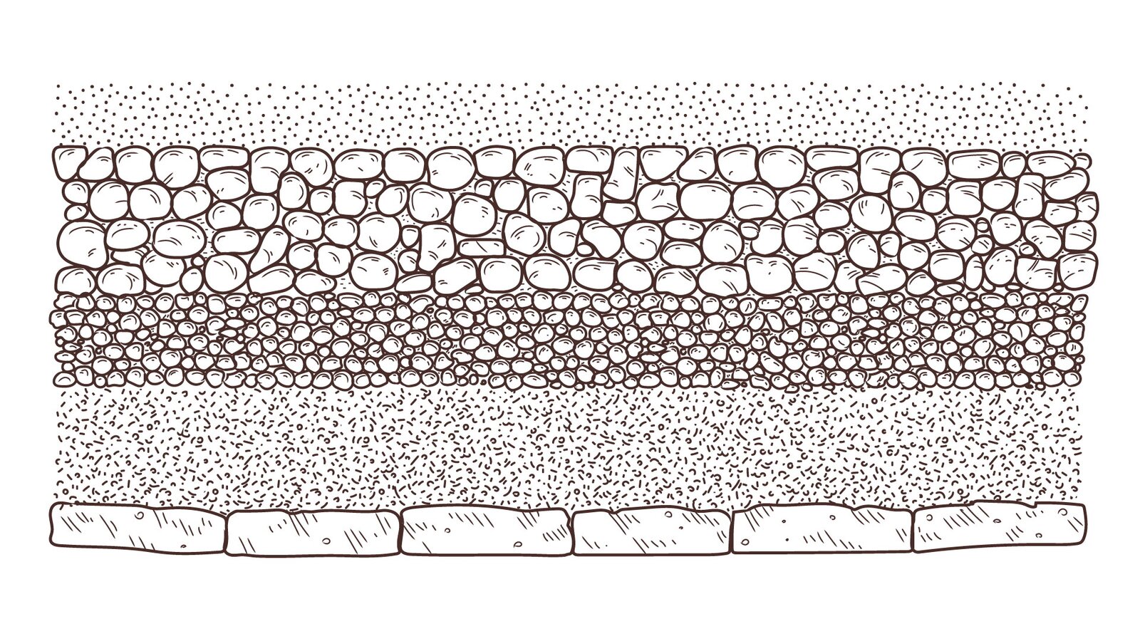 w powstałym zagłębionym pasie ukazującym przebieg drogi układano po kolei warstwy różnych materiałów: