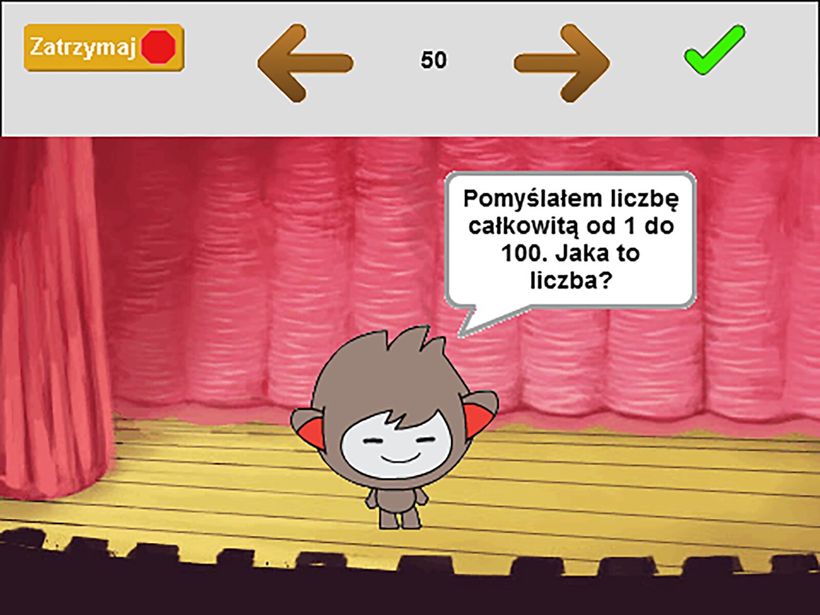 Gra interaktywna. Po naciśnięciu symbolu trójkąta na ekranie widać duszka znajdującego się na scenie. W lewym górnym okna gry widoczny jest przycisk uruchom. Po jego naciśnięciu nad duszkiem unosi się okno dialogowe z napisem: pomyślałem liczbę całkowitą od jeden do stu. Jaka to liczba. W górnej części okna, po prawej stronie przycisku zatrzymaj pojawiają się przyciski strzałka w lewo. Cyfra. Przykładowo jeden. Strzałka w prawo. Znak zatwierdzenia w kształcie ptaszka. Po zatwierdzeniu liczby duszek wydaje komunika przykładowo: moja liczba jest większa lub moja liczba jest mniejsza proszę wybierz ponownie. W przypadku odgadnięciu liczby w jak najmniejszej ilości prób pojawia się komunikat: brawo jesteś mistrzem. W przypadku odgadnięciu liczby przy większej ilości niż minimalna pojawia się przykładowy komunikat: odgadłeś liczbę w ósmej próbie. Możesz lepiej.