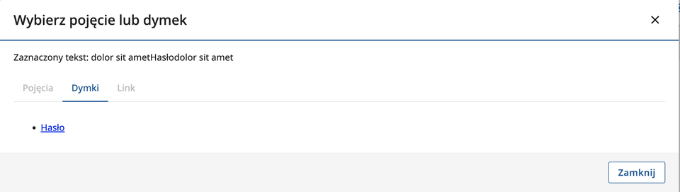 Dymek służy do wyjaśniania pojęć. Umożliwia wyświetlenie krótkiego opisu lub definicji w formie chmurki wyświetlanej po naprowadzeniu kursora na zaznaczone na niebiesko wyrażenie