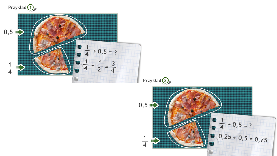Animacja przedstawia dodawanie ułamków zwykłych i dziesiętnych.