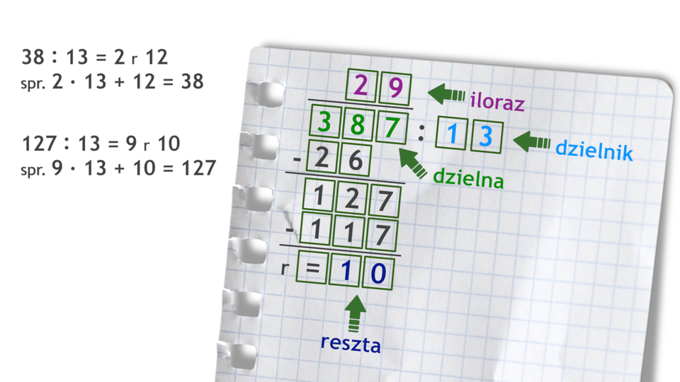 Na kartce w kratkę przedstawiono dzielnie dwóch liczb sposobem pisemnym. Zapisano liczbę osiemset trzynaście tak, że każda cyfra zapisana jest w osobnym kwadratowym polu. Obok zapisano znak dzielenia oraz dalej liczbę czterdzieści pięć. Nad dzielną narysowano poziomą kreską na której zapisujemy wynik dzielenia. Zaczynamy od dwóch pierwszych cyfry liczby osiemset trzynaście, czyli osiemdziesięciu jeden, ponieważ liczba czterdzieści pięć nie mieści się ani razu w liczbie osiem. Dzielimy zatem osiemdziesiąt jeden na czterdzieści pięć i zapisujemy wynik równy jeden na kresce wynikowej nad jedynką. Następnie pod osiemdziesiąt jeden zapisujemy wynik mnożenia jeden razy czterdzieści pięć, czyli czterdzieści pięć i oddzielamy te dwie liczby kreską poziomą po czym dokonujemy odejmowania. Wynikiem tego odejmowania jest liczba trzydzieści sześć, ale dopisujemy liczbę trzy i wówczas pod kreską pojawiają się liczba trzysta sześćdziesiąt trzy. Na kresce wynikowej nad trójką znajduje się osiem, ponieważ w trzystu sześćdziesięciu trzech, czterdzieści pięć mieści się osiem razy. Wówczas pod trzysta sześćdziesiąt trzy pojawia się wynik mnożenia liczb osiem i czterdzieści pięć, czyli trzysta sześćdziesiąt i ponownie oddzielamy te liczby od siebie, po czym dokonujemy odejmowania. Pod kreską zapisujemy wynik równy trzy, który oznacza resztę z tego dzielenia. Zatem wynik znajdujący się na głównej kresce to osiemnaście. Po prawo dokonano sprawdzenia, czyli zapisano czterdzieści pięć tak, że każda liczba znajduje się w osobnym kwadratowym polu i następnie pod nią zapisano liczbę osiemnaście tak, że każda liczba znajduje się w osobnym kwadratowym polu. Dodatkowo cyfry dziesiątek i jedności obu liczb znajdują się jedna pod drugą. Oddzielamy obie liczby poziomą kreska. Następnie dokonano mnożenia. Na początku mnożymy liczbę czterdzieści pięć przez cyfrę jedności drugiej liczby czyli osiem. Wówczas jeden kolumna jedności. pięć razy osiem równa się czterdzieści, cyfrę jedności tej liczby zapisujemy pod kreską wynikową pod ósemką, cyfrę dziesiątek liczby czterdzieści piszemy nad kolumną dziesiątek. Dwa kolumna dziesiątek. osiem razy cztery to trzydzieści dwa plus cztery równa się trzydzieści sześć i zapisujemy tą pełną liczbę pod kreską wynikową na lewo od ósemki. Otrzymujemy w ten sposób pierwszą liczbę pod kreską wynikową równą trzysta sześćdziesiąt. Dokonujemy mnożenia liczby czterdzieści pięć przez cyfrę dziesiątek liczby osiemnaście. Wówczas kolejne wyniki będziemy zapisywać z przesunięciem o jedno miejsce w lewo pod liczbą trzysta sześćdziesiąt. Jeden kolumna jedności. jeden razy pięć równa się pięć, zapisujemy otrzymaną liczbę pod szóstką. dwa kolumna dziesiątek jeden razy cztery równa się cztery, zapisujemy otrzymaną liczbę pod trójką. otrzymaliśmy liczbę czterdzieści pięć. Obie liczby oddzielamy poziomą kreską i dodajemy do siebie zaczynając od prawej strony. jeden kolumna jedności. w tej kolumnie znajduje się tylko zero zatem jest to cyfra jedności szukanego wyniku. dwa kolumna dziesiątek. sześć plus pięć równa się jedenaście, cyfra jedności liczby jedenaście stanowi cyfrę dzieciątek szukanego wyniku, cyfra dziesiątek liczby jedenaście zostaje zapisana nad kolumną setek. trzy kolumna setek. jeden plus trzy plus cztery równa się osiem co stanowi cyfrę setek szukanego wyniku. Wówczas wynik to osiemset dziesięć, a jej cyfry zapisane są w osobnym kwadratowym polu. Po prawo dokonujemy dodawania sposobem pisemnych. Zapisano liczbę osiemset dziesięć tak, że każda cyfra znajduje się w osobny kwadratowym polu. Pod nią zapisano liczbę trzy, dokładnie pod zerem. Oddzielono dwie liczby poziomą kreską i dodano je .Wówczas jeden kolumna jedności. zero w sumie z trójką daje trzy co stanowi cyfrę jedności szukanego wyniku. dwa kolumna dziesiątek, w tej kolumnie znajduje się jedynie jedynka, a więc zostaje przepisana pod kreskę wynikową i stanowi cyfrę dziesiątek szukanego wyniku. trzy kolumna setek. W tej kolumnie znajduje się jedynie cyfra osiem, która zostaje przepisana pod kreskę wynikowa i stanowi cyfrę setek w szukanym wyniku. Otrzymaliśmy wówczas osiemset trzynaście. Każda cyfra wyniku zapisana jest w osobnym kwadratowym polu. Pod obliczeniami pisemnymi zapisano osiemset trzynaście podzielić na czterdzieści pięć równa się osiemnaście reszty trzy.