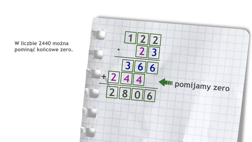 Mnożąc daną liczbę (np. w przykładzie powyżej) przez liczbę wielocyfrową (np. ), mnożymy daną liczbę przez kolejne cyfry liczby wielocyfrowej. Mnożenie rozpoczynamy od prawej strony (najpierw mnożymy przez , a następnie przez ). Pamiętajmy, żeby iloczyn przez kolejną cyfrę dolnej liczby () zapisać w odpowiednim miejscu. Na koniec dodajemy obliczone iloczyny.
